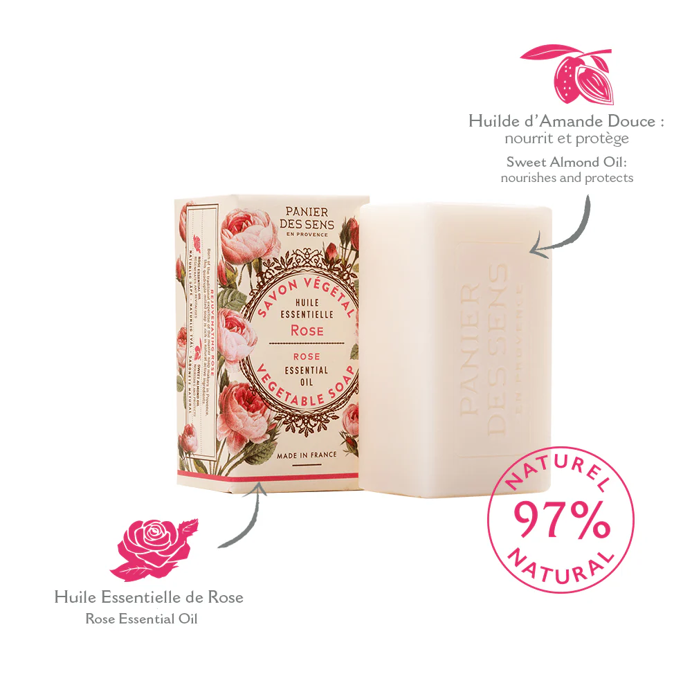 El jabón sólido vegetal Rosa Encantadora 150 g está elaborado con una base vegetal extrasuave, fruto del saber hacer tradicional de los maestros jaboneros de la Provenza. Su fórmula limpia la piel con suavidad mientras la envuelve con la delicada fragancia floral de la rosa.