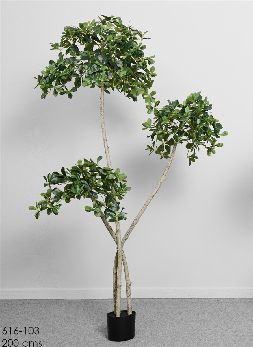 Aporta carácter, elegancia y un toque sofisticado a tu espacio con esta espectacular planta Givud artificial de 2 metros de altura. Su diseño estilizado y contemporáneo destaca por sus troncos entrelazados en tonos claros y sus copas de hojas verdes densas y brillantes, creando una silueta ligera y muy decorativa.